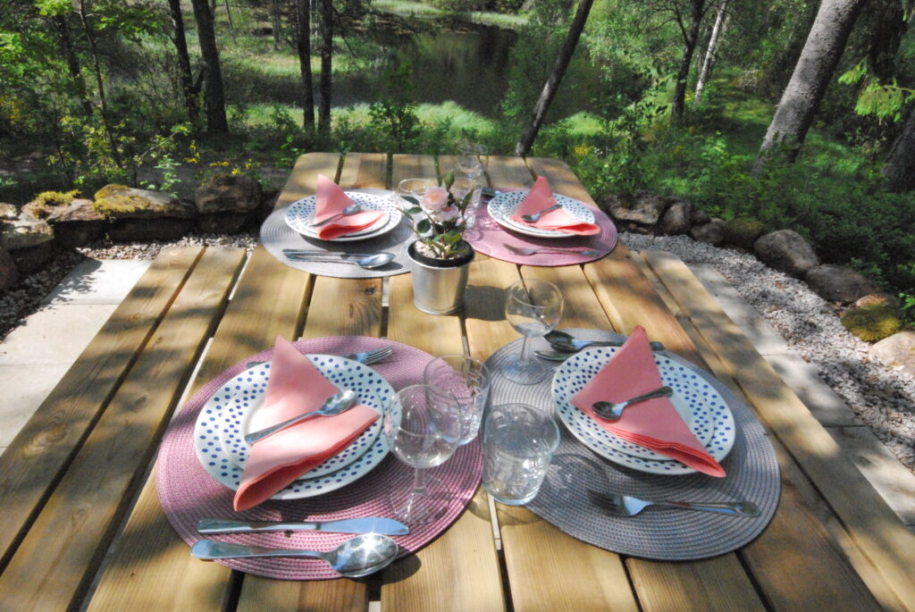 Vom etwas vom Haus entfernten zusätzlichen erhöhtem Sitzplatz mit Tisch / Bank haben Sie eine herrliche Aussicht in die Natur und auf den kleinen Waldsee.