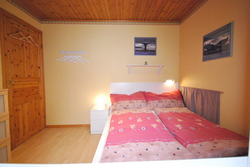 Das Schlafzimmer ist mit einem Doppelbett (140x200cm) ausgestattet. Ebenso finden Sie eine Kommode mit 3 Ausziehschubladen und einen Hochschrank mit viel Stauraum. Auch ein Verdunklungsrollo sowie ein Mückenschutzrollo am Fenster sind vorhanden. Wecker, Radio, Beleuchtung an jedem Bett, Schmutzwäschebehälter. Der Boden ist mit Laminat ausgestattet.