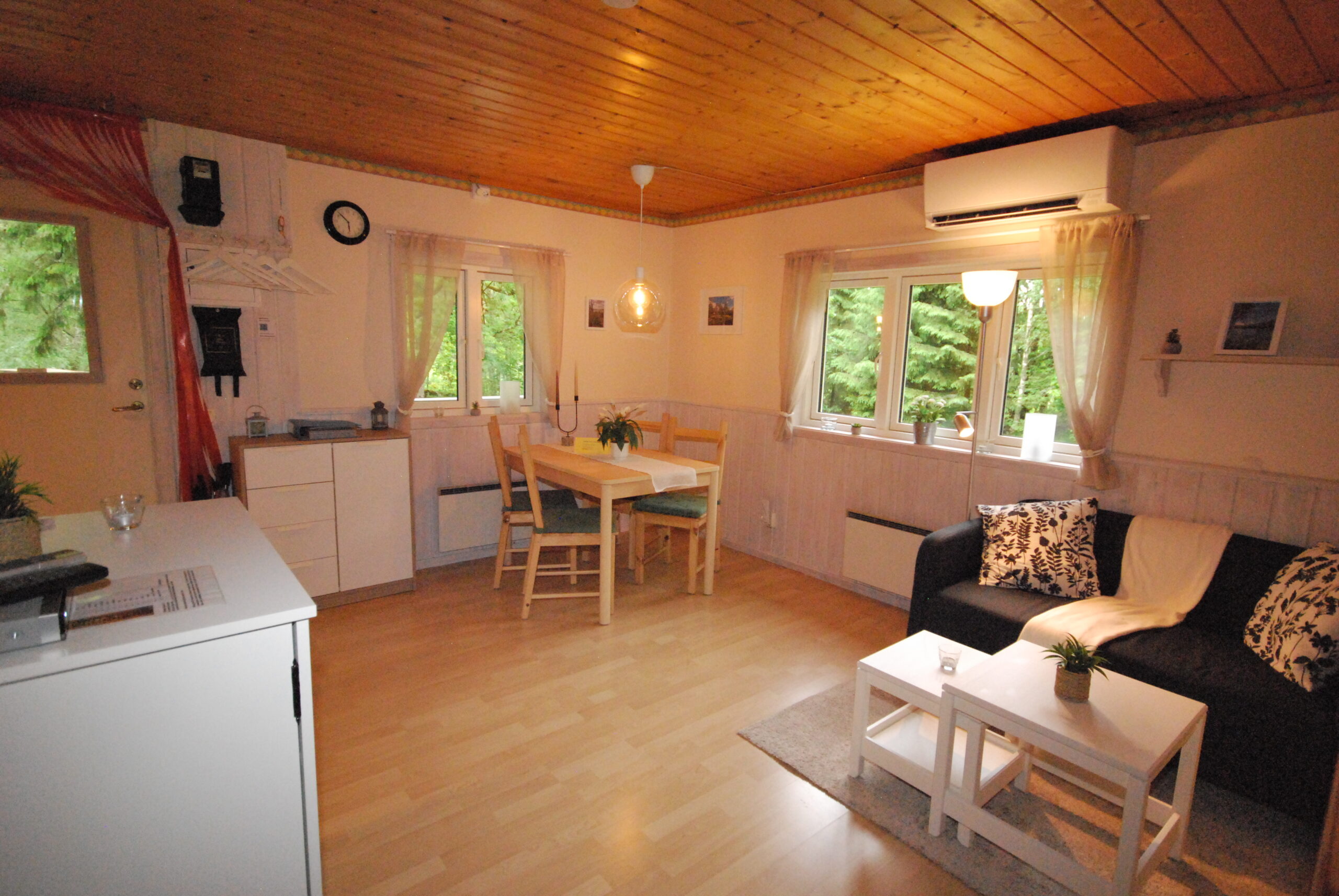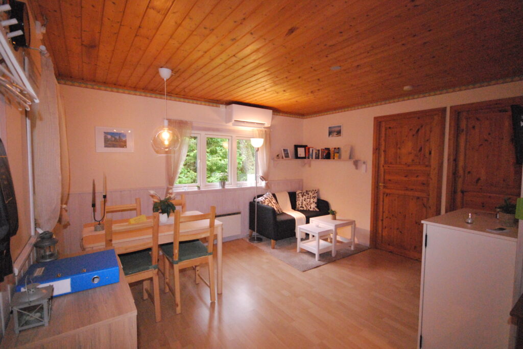 Das gemütliche Wohnzimmer mit Essbereich, ist typisch schwedisch in hellem Ton eingerichtet und mit Laminatboden ausgestattet. Kleines Sofa mit Beistelltisch, SAT TV mit u.a. deutschsprachigen und Schweizer Programmen, DVD Player, Radio/ CD-Spieler.