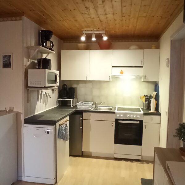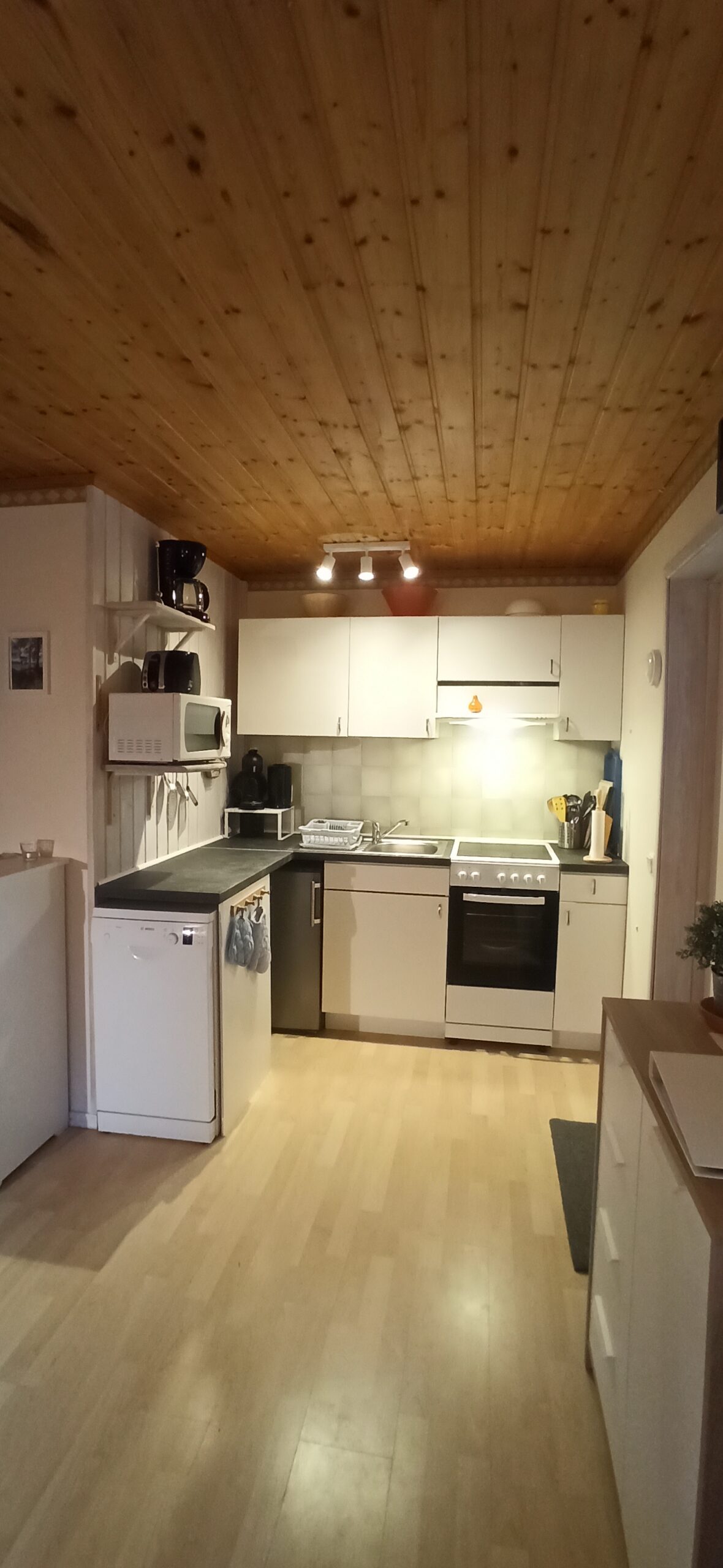 In der angrenzenden gut ausgestatteten Küche finden Sie: Kühlschrank mit Tiefkühlabteil, Kochfeld mit 4 Heizzonen und Backofen, Geschirrwaschmashine, Kaffeemaschine (Dolce Gusto / Filterkaffe) Wasserkocher, Mikrowelle, Toaster, genügend Geschirr für 4 Personen und vieles mehr.