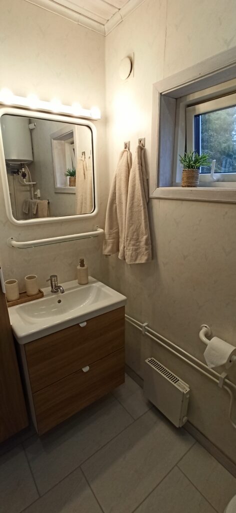 Das typisch schwedisch eingerichtete „Stuga“ (Ferienhaus) bietet Ihnen auf ca. 50m² alles, was Sie zum täglichen Bedarf benötigen. Wohnzimmer mit angrenzender Küche, 1 Schlafzimmer mit Doppelbett 180cm, 1 Schlafzimmer mit Doppelbett 140cm, Bad mit WC/Dusche/Lavabo, fliessend warmes/kaltes Wasser. Zentral steuerbare Wärmepumpenheizung/Klima sowie bei Bedarf Elektroheizungen in allen Räumen, überdachte Veranda mit Tisch und Stühlen.